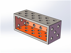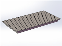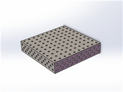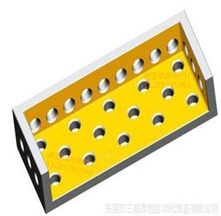 工作平臺(tái)采用帶孔格板形式。在高精度的臺(tái)面的上表面和4個(gè)側(cè)面,每隔100mm均布φ28mm的圓孔,并以同樣的間隔劃有尺寸線(xiàn),臺(tái)面邊緣可帶毫米刻度線(xiàn),臺(tái)面上的圓孔可用于拼接各種功能的定位模塊和夾具。