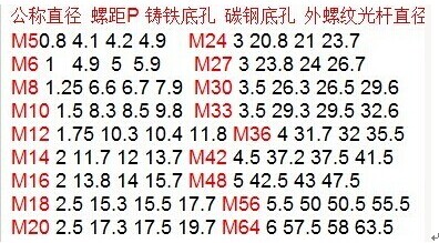 3.1. 常用米制普通粗牙螺紋的螺距如下表(螺紋底孔直徑:碳鋼φ=公稱直徑-P;鑄鐵φ=公稱直徑-1.05~1.1P;加工外螺紋光桿直徑取φ=公稱直徑-0.13P):